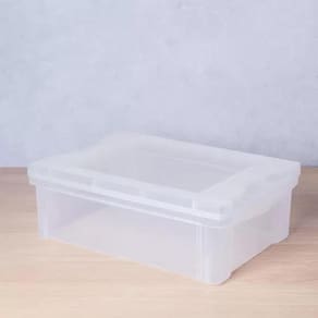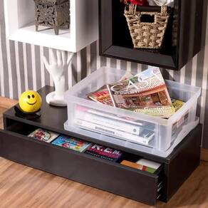 Garantia: 90 dias / Peso: 640g / Cor predominante: transparente / Ref.: 21001; Dimensões totais: 42,5cm (C) x 30,5cm (L) x 14,5cm (A); Área de uso: 38cm (C) x 27cm (L) x 10,5cm (A); Capacidade: 13,5 litros; Material: polipropileno; Conteúdo: 1 caixa plástica organizadora.
