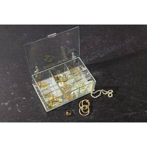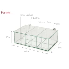 Caixa com tampa de vidro e alumínio com fundo espelhado e 6 divisórias