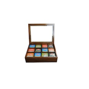 Prático e luxuoso, na linha madeira maciça encontrarmos um toque vintage, objeto decorativo onde são visíveis os veios naturais da madeira. Nossos estojos/caixas irão facilitar seu dia a dia com a organização para os saches de Chá, além de proporcionar um ambiente mais sofisticado e elegante.Produzida com madeira natural de reflorestamento. Escolhida rigorosamente, totalmente tratada, tingida e envernizada externamente. Internamente. Na linha madeira maciça é possível observar os veios naturais da madeira. A tampa possui visor com vidro transparente. O acabamento interno com as divisórias é feito na própria madeira. Características das caixas para chá:- Produto fabricado em madeira maciça de qualidade,- Padrão Imbuia, - Não empena,- Tampa de vidro 2 mm,- Medidas aproximadas dos casulos larg x comp x alt : 7,5 x 7,5 x 7,0 cm. Chás não acompanham o estojo - Imagens meramente ilustrativas