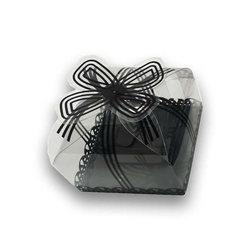 especificações marca: embala cristal modelo: caixa para 4 brigadeiros com laço preto cor da caixa: transparente com preto material da caixa: plástico acetato quantidade: 10 caixas medidas c x l x a : 7 x 7 x 4 centímetros