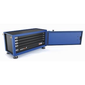 Estrutura em chapas de aço conformadas de 1,2 mm. 5 gavetas com corrediças telescópicas. Fechadura reforçada com chave. Porta com borracha de vedação contra poeira. Pintura eletrostática. Capacidade de carga máxima gavetas com altura de 50 mm: 30 kg. Capacidade de carga máxima gavetas com altura de 105 mm: 40 kg. 4 pés com sistema de amortecimento anti vibração (Vibra stop). Utilizado para o armazenamento de ferramentas e base de trabalho para manutenção de peças. Capacidade de carga e resistência da estrutura comprovadas através de testes práticos.