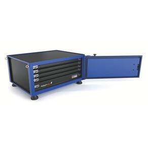 Estrutura em chapas de aço conformadas de 1,2 mm. 5 gavetas com corrediças telescópicas.Fechadura reforçada com chave.Porta com borracha de vedação contra poeira.Pintura eletrostática.Capacidade de carga máxima gavetas com altura de 50 mm: 30 kg.Capacidade de carga máxima gavetas com altura de 105 mm: 40 kg.4 pés com sistema de amortecimento anti vibração (Vibra stop).Utilizado para o armazenamento de ferramentas e base de trabalho para manutenção de peças.Capacidade de carga e resistência da estrutura comprovadas através de testes práticos.