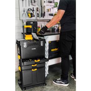 Destaques: A caixa superior possui duas travas metálicas frontais reforçadas, permitindo o travamento com cadeado, dois compartimentos externos na tampa, além de bandeja interna removível. Possui três gavetas na caixa central, uma gaveta basculante na caixa inferior e rodas para transporte.