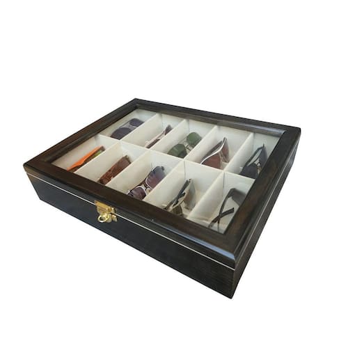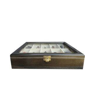 Caixa para óculos 10 divisórias ébano flocado bege Ébano flocado de bege: ébano f/ bege Prático e luxuoso, na linha madeira maciça encontrarmos um toque vintage, objeto decorativo onde são visíveis os veios naturais da madeira. Nossos estojos irão facilitar seu dia a dia com a organização e segurança que sua coleção precisa, além de proporcionar um ambiente mais sofisticado e elegante. Produzida com madeira natural de reflorestamento. Escolhida rigorosamente, tratada com fungicidas e anticupins. Envernizada externamente com verniz poliuretano industrial. Internamente as laterais e divisórias são revestidas com nylon aveludado. E as almofadas que acompanham o produto, normalmente são também em tecido aveludado. Na linha madeira maciça é possível observar os veios naturais da madeira. As dobradiças não são aparentes e possuem um limitador. A tampa possui visor com vidro transparente. Acompanha um fecho giratório de pressão em metal, ideal para colocar cadeado. Seus relógios sempre bem protegidos e acomodados confortavelmente, com toda segurança e facilidade no manuseio.