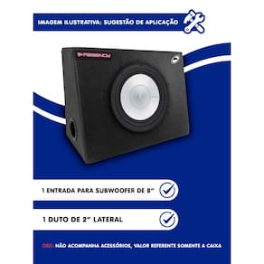 CARACTERÍSTICAS - Ideal para veículos compactos: projetada para um subwoofer de 8" com duto lateral de 2", otimizando espaço sem perder qualidade sonora; - Performance acústica eficiente: configuração dutada que favorece graves mais potentes e definição sonora; - Construção resistente: fabricada em MDF de alta espessura, com revestimento de courvin perfurado preto e manta isolante interna; - Montagem segura e estável: estrutura robusta que reduz vibrações e mantém alinhamento ideal em veículos em movimento.