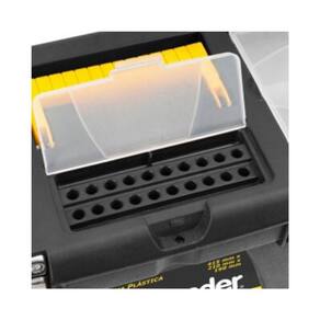 Possui duas travas, três compartimentos externos dois removíveis e bandeja para ferramentas removível