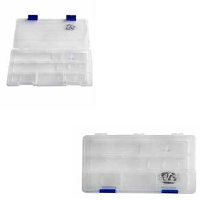 Modelo: HZ002 Material: Plástico de alta resistencia Tamanho (CM): Comprimento x Largura x Altura (23x12x3,5) Peso: 150g Repartições: 5 fixas (Possibilidade de ajuste para até 15 espaços com divisórias móveis) Cor: Transparente com fechos azuis