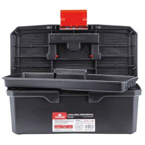 Especificações Material: Polipropileno Altura: 170mm Largura: 170mm Comprimento: 320mm Peso: 0,6kg Itens Inclusos 1 Caixa Plástica Para Ferramentas 12,5'' Com Bandeja Worker Perguntas Frequentes (FAQ) Pergunta: Qual o material da caixa?