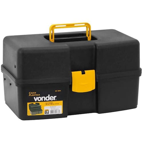 Caixa plástica Para Ferramentas Vonder.- Fabricado em polipropileno- Indicada para organizar, armazenar e transportar ferramentas, peças e acessórios em geral- Possui três bandejas fixas e articuladas com divisórias removíveis- Comprimento da caixa plástica (mm):370,0- Largura da caixa plástica (mm):220,0- Altura da caixa plástica (mm):200,0- Cor da caixa plástica:Preta e amarela- Capacidade de carga: 6 kg
