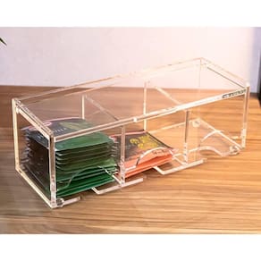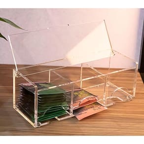 Organize seus sachês com a Caixa Porta Sachês de Chá Centauri Acrílicos, modelo com 3 nichos em acrílico 5 mm, ideal para áreas de café e cozinha. Com divisórias fixas e tampa articulada, ela facilita o acesso e mantém os sachês sempre bem organizados. Os 3 nichos internos acomodam os sachês deitados, permitindo rápida visualização dos sabores e melhor aproveitamento do espaço. O acrílico cristal transparente valoriza o ambiente e combina com diferentes estilos de decoração em cozinhas, cafés, bares, restaurantes, recepções e escritórios. Produzida com cortes precisos a laser e pezinhos antiderrapantes, oferece acabamento limpo, estabilidade e proteção para a bancada.