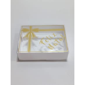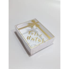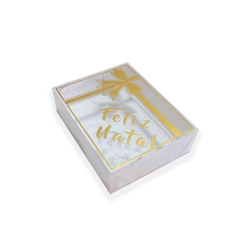 A Caixa para Presente Natal Embala Cristal é excelente para diversas finalidades como doces, presentes, ou o que sua imaginação permitir A tampa possui a escrita na cor dourada, conforme imagem. Possui o fundo em papel branco duplex resistente e a tampa/visor de acetato transparente com detalhes dourados.