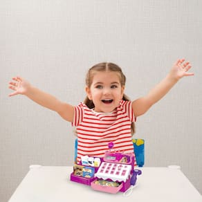 Esta incrível lojinha vem equipada com tudo que você precisa para criar momentos encantadores: produtos faz-de-conta, caixa com dinheiro, cartão e moedas, uma calculadora funcional e um scanner para bipar!