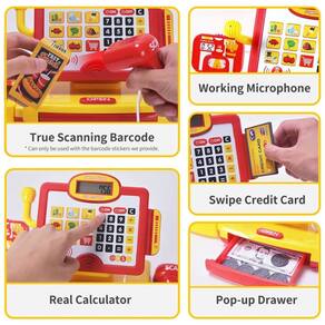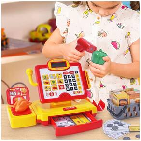 Caixa Registradora Interativa com Microfone e Efeitos Sonoros Botões com palavras sonoras e "beep" ao escanear/passar cartão. Microfone amplifica voz para estimular fala e canto. Brinquedo interativo que promove comunicação, matemática básica e coordenação motora. Inclui caixa, scanner simulado, cesta, dinheiro de mentira, cartões, alimentos de brinquedo (vegetais, hambúrgueres), utensílios e pratos. Presente ideal para festas e datas comemorativas (meninas e meninos 6-8 anos). Material durável e seguro, testado conforme normas internacionais.