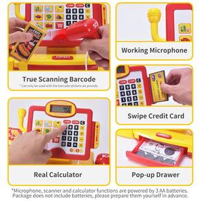Caixa Registradora Multifuncional com Leitor de Código de Barras, Calculadora, Microfone, Gaveta Pop-Up, Cesta e Acessórios de Comida DIY Simula processo de compras, ensina sobre dinheiro e desenvolve habilidades sociais (4-5 anos). Inclui alimentos simulados, notas, moedas e efeitos sonoros para aprendizado lúdico (3-5 anos). Brinquedo educativo ideal para matemática básica e roleplay (5-7 anos). Presente para datas festivas (Natal, Páscoa, aniversários).
