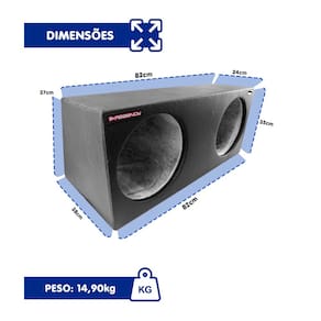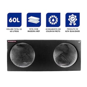 CARACTERÍSTICAS - Capacidade completa: suporte para 2 subwoofers de 12", 1 corneta e 1 tweeter, ideal para sistemas de som automotivo potentes; - Estrutura selada com volume interno de 60 litros, garantindo graves mais controlados e redução de distorções; - Acabamento resistente: confeccionada em MDF de 15–18 mm, revestida com courvin perfurado preto e manta isolante acrílica interna; - Fixação segura: equipada com plugs parafusados com fio e vedação com cola branca e serragem, evitando vibrações indesejadas.