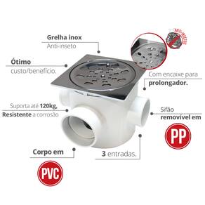 Benefícios do Produto: • Em conformidade com a norma NBR 5688 e NBR 8160. • Sifão em PP removível e corpo em PVC. • Ótimo custo/benefício. • Com encaixe para prolongamento. • Grelha produzida em aço inoxidável. • Alto padrão de acabamento. • Alta resistência e fácil instalação. • Material resistente à corrosão. • Fecho que impossibilita o retorno de insetos. • Suporta até 120 kg.