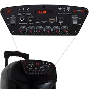Itens inclusos: 1 Caixa de Som Bluetooth, 1 Fonte de Alimentação, 1 Microfone, 1 Adaptador P10 (6,5mm) para P2 (3,5mm), 1 Manual (português)