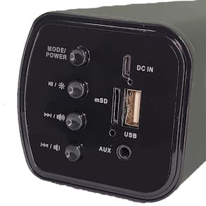 Potência: 16W 8Wx2 RMS Conexão: Bluetooth, P2, USB, Cartão de memória, Rádio Alimentação: 5Vdc via porta USB Resposta de frequência: 20Hz 20KHz Sensibilidade: 70dB Impedância: 4 Ohms Dimensões: 48 x 8.5 x 8 cm Comprimento x Largura x Altura Composição: Termoplásticos, metais e circuito eletrônico
