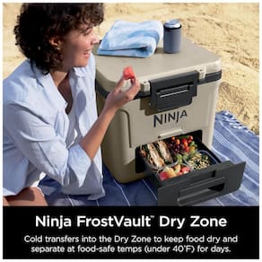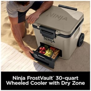 A caixa térmica com rodas Ninja FrostVault 30QT foi desenvolvida para conservação de bebidas e alimentos em ambientes externos, com isolamento de alto desempenho e gaveta inferior em zona seca refrigerada. A tecnologia FrostVault transfere o frio do compartimento principal para a gaveta Dry Zone, mantendo os alimentos frios, secos e separados do gelo, em faixa de temperatura segura abaixo de 4,5°C por vários dias quando utilizada com gelo adequado.
