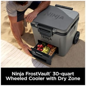 A caixa térmica com rodas Ninja FrostVault 30QT foi desenvolvida para conservação de bebidas e alimentos em ambientes externos, com isolamento de alto desempenho e gaveta inferior em zona seca refrigerada. A tecnologia FrostVault transfere o frio do compartimento principal para a gaveta Dry Zone, mantendo os alimentos frios, secos e separados do gelo, em faixa de temperatura segura abaixo de 4,5°C por vários dias quando utilizada com gelo adequado.