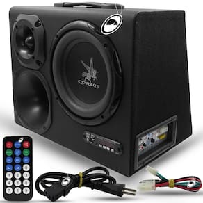 Caixa Trio Amplificada Cx Hc500 8 Polegadas 110/220W E 12V Bluetooth Corzus DESCRIÇÃO:A Corzus CXHC 500 8 Polegadas é uma caixa amplificada com conceito inovador de dupla função. Podendo ser utilizada em casa como caixa de som portátil 110/220V ou em carros como caixa de subgrave e caixa trio em 12V, entrada de áudio via RCA alta impedância e via fio baixa impedância , sistema de reprodução de áudio integrado com Bluetooth, USB pen drive , SD card e auxiliar P2.Amplificador digital de 300 Watts RMS de altíssima eficiência e baixo consumo proporcionando uma ótima qualidade de áudio.PRINCIPAIS CARACTERÍSTICAS:- Player Bluetooth, USB pen drive , SD Card e auxiliar P2;- 110 / 220V automático;- Caixa em madeira MDF;- Entrada de Áudio de baixa impedância via fio e alta impedância RCA;- Acionamento automático por áudio na entrada de baixa impedância.ESPECIFICAÇÕES TÉCNICAS:- Potência de RMS total: 300 Watts; - Resposta de frequência senoidal trio THD 0.01% : De 20 Hz a 20 KHz -3dB ;- Resposta de frequência senoidal sub THD 0.01% : De 20 Hz a 100Hz -3dB ;- Alto falante 8 bobina simples: 200 Watts;- Drive: 50 Watts; - Tweeter: 50 Watts;- Amplificador digital: 300 Watts; - Caixa: Madeira MDF;- Distorção máxima de saída THD : 0.01%;- Proteção de temperatura: 80 C;- Consumo máximo: 20A;- Tensão de operação Voltagem de entrada de funcionamento: 10Vcc A 15Vcc;- Tensão de proteção Voltagem de entrada limite : 8.0vcc A 16Vcc;- Sensibilidade de entrada RCA Sinal de áudio necessário para obter potência máxima :0.5vrms A 5Vrms;- Garantia: 1 ano contra defeitos de fábrica.ITENS INCLUSOS:- 1 Caixa Amplificadora;- 1 Controle Remoto;- 1 Cabo para Tomada;- 1 Cabo para Veículo;- 1 Certificado de Garantia.Homologação Anatel: 060792000160