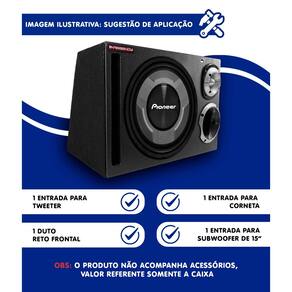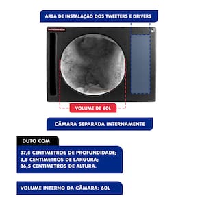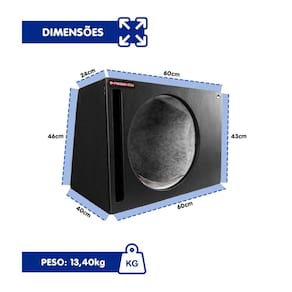 CARACTERÍSTICAS - Capacidade completa: acomoda 1 subwoofer de 15", 1 corneta e 1 tweeter, ideal para sistemas de som automotivo potentes; - Volume interno eficiente: estrutura com 60 L, proporcionando controle de pressão e graves mais definidos; - Construção resistente: fabricada em MDF de 15–18 mm, revestida com courvin perfurado preto e manta isolante interna; - Design funcional: duto reto que favorece a eficiência acústica e facilita a adaptação em diversos espaços do veículo.