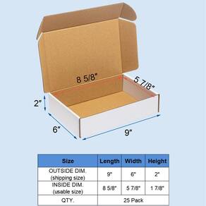 Informações básicas sobre caixas de remessa brancas: Dimensões internas utilizáveis: 8 5/8" x 5 7/8" x 1 7/8", Dimensões externas: 9x6x2", pacote com 25. Material: papelão reciclado, cor branca.