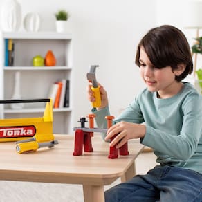O Tonka Tough Builders é um conjunto de ferramentas resistente e feito com plástico durável, ideal para meninos e meninas a partir de 3 anos. Este conjunto de dramatização permite que as crianças explorem aventuras de construção sem limites, com 12 ferramentas e acessórios de brinquedo, uma loja e estojo de transporte, além de um banco de trabalho montável e cores vibrantes. A marca Tonka é sinônimo de alta qualidade e confiança, com mais de 75 anos de história, inspirando brincadeiras ativas e criativas, tanto ao ar livre quanto dentro de casa, incentivando habilidades de resolução de problemas, coordenação motora e brincadeiras imaginativas. O conjunto inclui ferramentas como martelo, chave inglesa, chave de fenda e caixa de ferramentas, fazendo com que o pequeno construtor se sinta como um verdadeiro profissional.