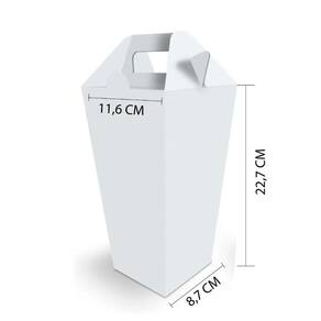 Descrição da EmbalagemModelos disponíveis: listrado, pets, branco, kraftMaterial: Papel Cartão Triplex com certificação para contato com alimentos Dimensões: 19cm altura x 7,2cm na base x 9,7cm na boca