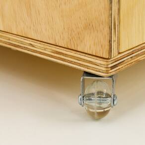 Fabricado em compensado de pinus com pintura atóxica, possui pequenos cortes laterais permitindo o encaixe das mãos. Os rodízios de silicone possibilitam que o mesmo seja movimentado com facilidade entre os espaços de casa, da escola ou da brinquedoteca.