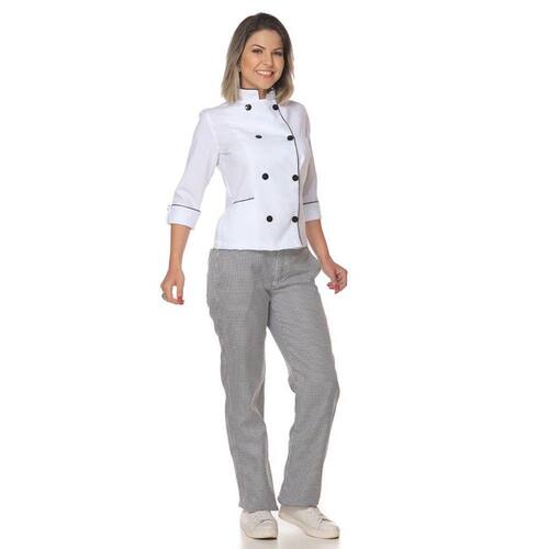 A Calça Cozinheira é confeccionada em tecido brim leve PIED POULE.
