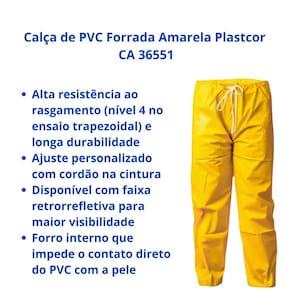 Calça de PVC Forrada Amarela Plastcor CA 36551 Proteção e conforto em ambientes úmidos Calça de segurança confeccionada em tecido 100% poliéster revestido com PVC, com cordão regulável na cintura e design ergonômico para máximo conforto. Ideal para atividades que exigem proteção contra umidade e respingos de água.