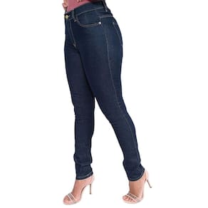 Lavagem jeans escuro. Fechamento em zíper e com botão.
