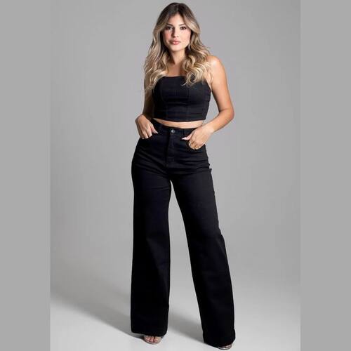 Calça feminina confeccionada em sarja. O modelo possui cintura super alta, gancho no lugar e caimento amplo da coxa até a barra. Cintura alta Fechamento através de um botão e zíper Bolsos frontais e posteriores funcionais. Barra simples Tecido: Sarja Tipo de Lavagem: Color Cor: Preto Composição:73% Algodão 24%Poliéster 3%Elastano Medidas Modelo Manequim 38