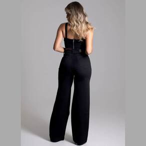Calça feminina confeccionada em sarja. O modelo possui cintura super alta, gancho no lugar e caimento amplo da coxa até a barra. Cintura alta Fechamento através de um botão e zíper Bolsos frontais e posteriores funcionais. Barra simples Tecido: Sarja Tipo de Lavagem: Color Cor: Preto Composição:73% Algodão 24%Poliéster 3%Elastano Medidas Modelo Manequim 38