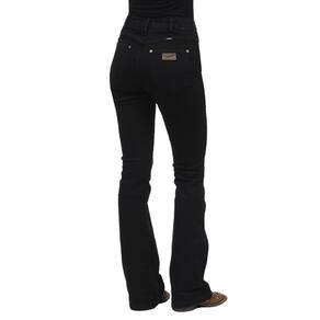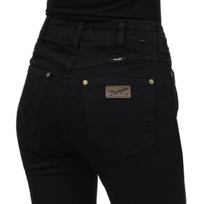 Uma Calça jeans feminina na qualidade Wrangler modelo Flare, fabricada em tecido jeans de alta qualidade 80% Algodão, 18% Poliéster e 2% Elastano de alta qualidade na cor Preta, possui 3 bolsos na frente e 2 atrás em modelo tradicional, rebites de metal e botão personalizado.