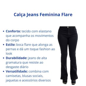 A calça jeans feminina flare é confeccionada em tecido denim com toque macio e leve elastano, proporcionando caimento fluido e conforto. Seu corte flare valoriza a silhueta e oferece um visual elegante que transita facilmente do ambiente de trabalho a ocasiões casuais.
