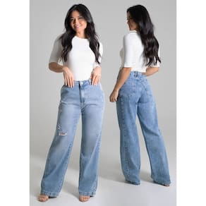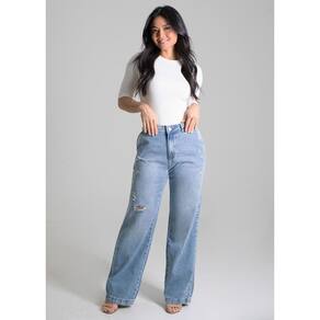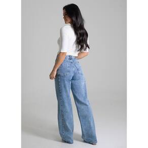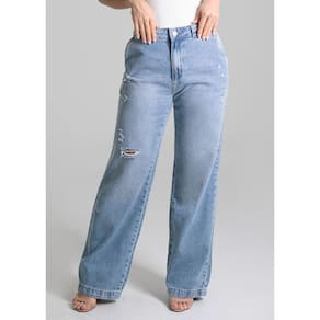 Calça feminina confeccionada em jeans. O modelo possui cintura super alta, gancho no lugar e caimento amplo da coxa até a barra. Cintura alta Fechamento através de um botão e zíper Bolsos frontais com leves puídos e posteriores funcionais Barra simples Tecido: Jeans Tipo de Lavagem: Azul Cor: Azul claro