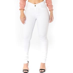 fechamento em botão dourado e zíper, jeans branco de alta qualidade que modela e se ajusta facilmente ao corpo.