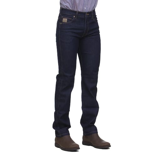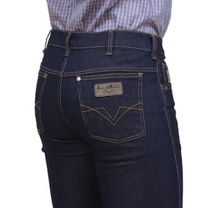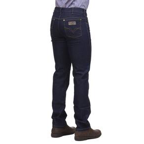 Calça jeans masculina na qualidade Land Horse, fabricada em tecido 74% Algodão 24% Poliéster 2% Elastano na cor Azul Escuro, possui 3 bolsos na frente e 2 atrás em modelo tradicional, rebites de metal e botão personalizado.