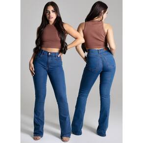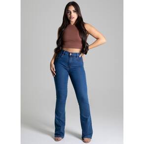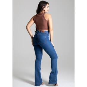A modelagem boot cut tem o caimento ajustado nas pernas e levemente ampla barra. Cintura média Fechamento com botão e zíper Bolsos frontais falsos e posteriores funcionais Barra simples Modelagem: boot cut Tecido: Jeans Tipo de lavagem: Azul Cor: Azul médio