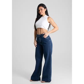 Calça feminina confeccionada em jeans. O modelo possui cintura super alta, gancho no lugar e caimento amplo da coxa até a barra. Cintura alta Fechamento através de um botão e zíper Bolsos frontais e posteriores funcionais Barra simples Tecido: Jeans Tipo de Lavagem: Azul Cor: Azul