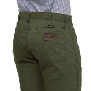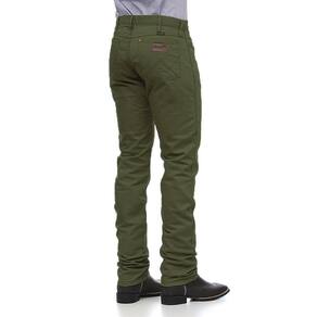 Calça masculina Wrangler modelo Cowboy Cut, fabricada em tecido 100% Algodão na cor Verde, possui 3 bolsos frontais e 2 traseiros em modelo tradicional, etiqueta da marca no bolso, rebites de metal e botão personalizado.