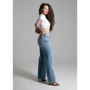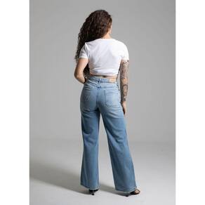 Calça feminina confeccionada em jeans. O modelo possui cintura super alta, gancho no lugar e caimento amplo da coxa até a barra.