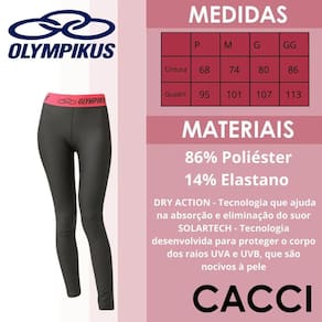 A Legging Eleva é confeccionada em malha de poliéster e elastano. Com toque macio e maior capacidade de absorção de suor, mantendo seu corpo seco, além de proteger contra os raios UVA e UVB. Possui modelagem especial com reforço no entrepernas para não marcar e para que você se sinta à vontade. As costuras flatlock dão um toque macio, proporcionando maior conforto, pois não geram atrito contra a pele. Seu cós é diferenciado, com elástico personalizado Olympikus e efeito cruzado na frente. Tecnologias: DRY ACTION - Tecnologia que ajuda na absorção e eliminação do suor. É ideal para todo tipo de esporte, já que evita a aderência do tecido ao corpo, facilitando qualquer tipo de movimento. SOLARTECH - Tecnologia desenvolvida para proteger o corpo dos raios UVA e UVB, que são nocivos à pele. Composição: Tecido Principal:86% Poliéster / 14% Elastano.