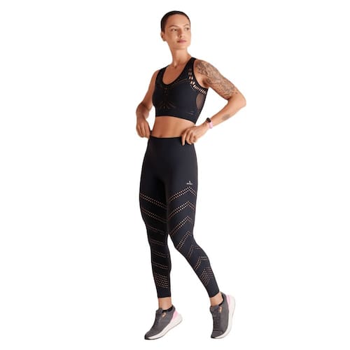 DESCRIÇÃO Legging Seamless Dry (sem costura) com a tecnologia Raschel e Antimicrobial, possui o diferencial de um corte específico de micro furos que proporciona maior respirabilidade e constroem desenhos na peça. Possui o cós largo e anatômico com aplicação de silicone interna que garante segurança durante o movimento na atividade. Os pontos de textura melhoram a sustentaçaõ e modelam a silhueta.