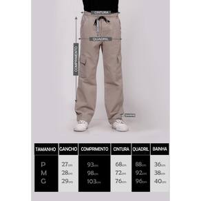 tamanho G: cintura 76 cm; comprimento 103 cm; quadril 96 cm; bainha 40 cm; gancho 29 cm.