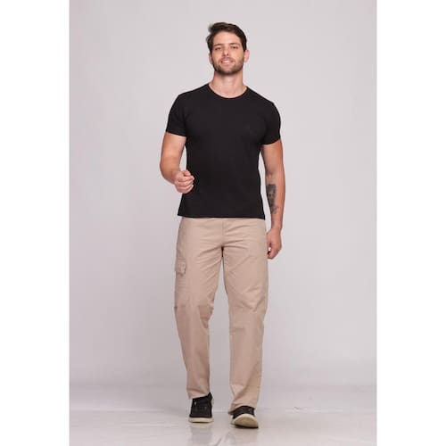 Calça sarja, modelagem mais larga, maior conforto.
