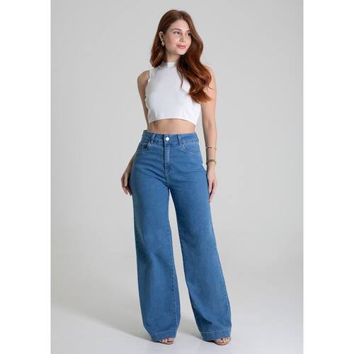 Calça feminina confeccionada em jeans. O modelo possui cintura super alta, gancho no lugar e caimento amplo da coxa até a barra. Cintura alta Fechamento através de um botão e zíper Bolsos frontais e posteriores funcionais Barra simples Tecido: Jeans Tipo de Lavagem: Azul Cor: Azul claro