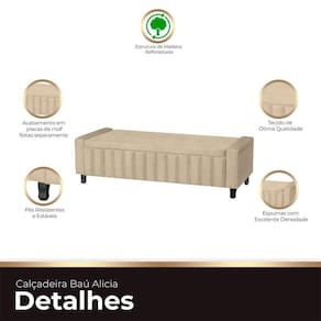 Eleve o estilo do seu quarto com a Calçadeira Baú Estofada Alicia, uma fusão perfeita de modernidade e sofisticação. Seu design estiloso e detalhes em formato de ripas na frente conferem uma estética única, enquanto o assento liso adiciona um toque de elegância discreta. Além de funcional como baú, esta calçadeira é mais do que um móvel; é uma peça de design que transforma o ambiente. Com uma decoração inigualável, a Alicia é o complemento perfeito para o seu quarto, proporcionando um toque de elegância que não passará despercebido. Renove o seu espaço com esta calçadeira que transcende o convencional.